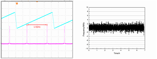 研究團隊采用了環(huán)形諧振腔結(jié)構(gòu)結(jié)合碘分子吸收頻率鎖定技術(shù),實現(xiàn)了單頻激光的頻率長期穩(wěn)定性。該技術(shù)通過將激光頻率鎖定在碘分子特定吸收譜線的側(cè)翼,利用反饋控制調(diào)整諧振腔的長度,實現(xiàn)了激光頻率的高精度穩(wěn)定。結(jié)果顯示:激光器輸出激光光束質(zhì)量優(yōu)異,M2因子分別在1.05(水平方向)和1.19(豎直方向),表明其具有良好的空間分布特性;輸出激光線寬小于10兆赫茲,顯示出良好的單頻特性;自由運轉(zhuǎn)狀態(tài)下,一定時間內(nèi)激光器頻漂超過了200兆赫茲。而鎖定狀態(tài)下,激光器連續(xù)運行7小時頻漂控制在±4兆赫茲以內(nèi),顯著提高了頻率穩(wěn)定性。另外,為了適應(yīng)未來的設(shè)備集成,激光器小型化、穩(wěn)定性等需求,實現(xiàn)了連續(xù)單頻激光器基于光機熱電耦合的工程化設(shè)計與激光器系統(tǒng)搭建。