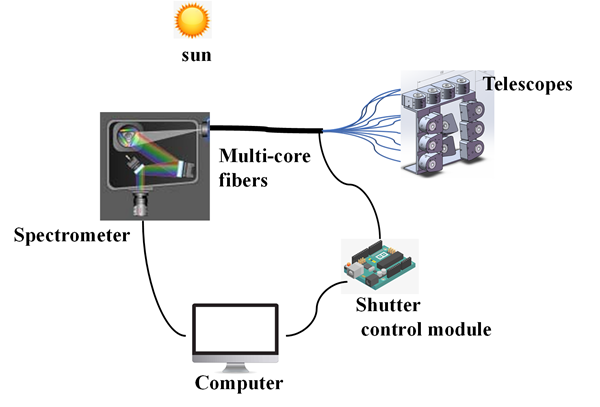 ?團隊基于離軸多路光譜遙測的思想,采用科研級CCD成像光譜儀,自主設計的小視場角望遠鏡、Y型同軸分束光纖、多路機械快門控制模塊實現(xiàn)了分鐘級同步多軸的光譜采集,突破了以往多軸差分吸收光譜(MAX-DOAS)系統(tǒng)的采集時間分辨率限制。研究成果有望成為車載移動平臺大氣監(jiān)測的核心設備,為大氣污染監(jiān)測和污染源溯源研究提供有力支持。