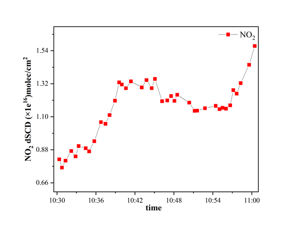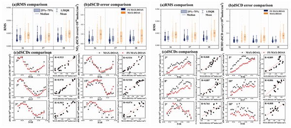 ?研究團隊采用多仰角同步采集的方式取代了單鏡頭順序采集,構建了一套地基、車載均適用的同步多軸遙測系統(tǒng),實現(xiàn)了一個循環(huán)仰角光譜的分鐘級探測,如圖2所示,傳統(tǒng)MAX-DOAS的系統(tǒng)分辨率一般為七分鐘,新系統(tǒng)極大提升了采集時間分辨率。在外場試驗中,同步多軸系統(tǒng)與MAX-DOAS、LP-DOAS系統(tǒng)同期觀測的結果如下:在DOAS方法反演痕量氣體斜柱濃度中,RMS、dSCD誤差是衡量濃度準確性的重要指標,同步多軸系統(tǒng)反演NO2、HCHO的RMS、dSCD誤差均低于MAX-DOAS,兩系統(tǒng)反演NO2、HCHO濃度的相關性分別為0.978和0.850,由于提高了時間分辨率,同步多軸系統(tǒng)反演的氣體廓線結果比MAX-DOAS的更細致;NO2近地面濃度對比實驗中,同步多軸系統(tǒng)與LP-DOAS系統(tǒng)測得的數(shù)據(jù)相關性高達0.901。后續(xù)同步多軸系統(tǒng)將繼續(xù)拓寬其在高時間分辨污染氣體立體分布遙感領域的應用,發(fā)揮其多仰角多組分同步監(jiān)測的優(yōu)勢。