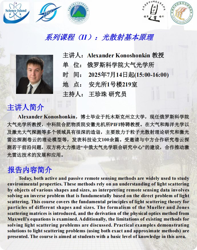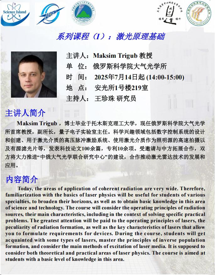 中俄大氣光學(xué)聯(lián)合研究中心國際課程:激光原理基礎(chǔ)、光散射基本原理(每周1/3/5)